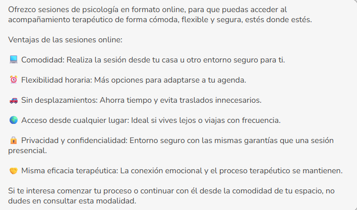 Sea cual sea la terapia que necesites (Problemas de conducta, Traumas, Adolescentes, Desarrollo personal, Motivación, Trastornos de estrés post-traumático, inseguridad, dudas y miedos), podrás recibir tu sesión conmigo de forma presencial en mi consulta psicológica, vía online desde donde quieras o, si lo prefieres, yo misma puedo acudir a tu domicilio. Asimismo, las sesiones podrán ser individuales, grupales o en pareja.